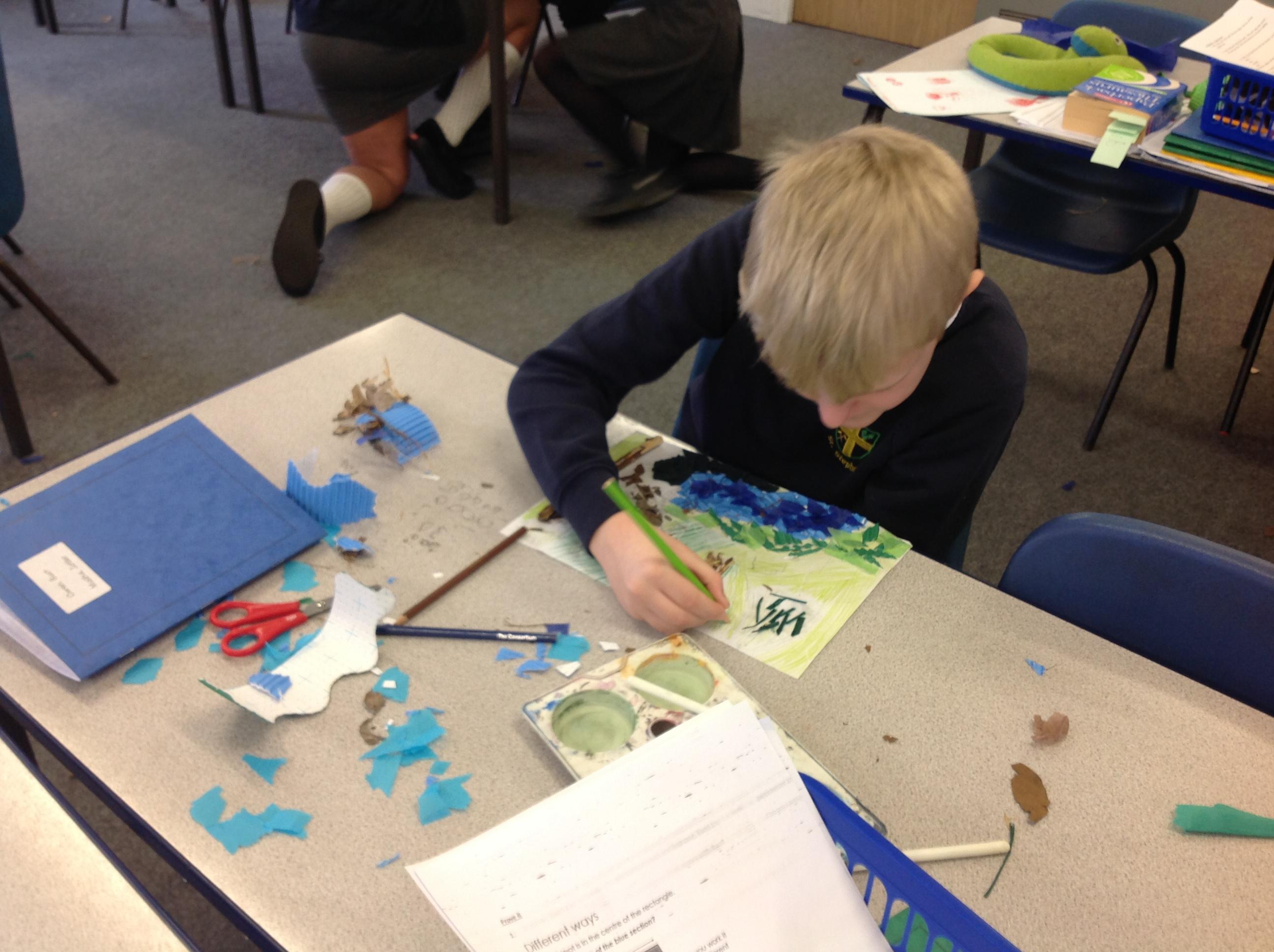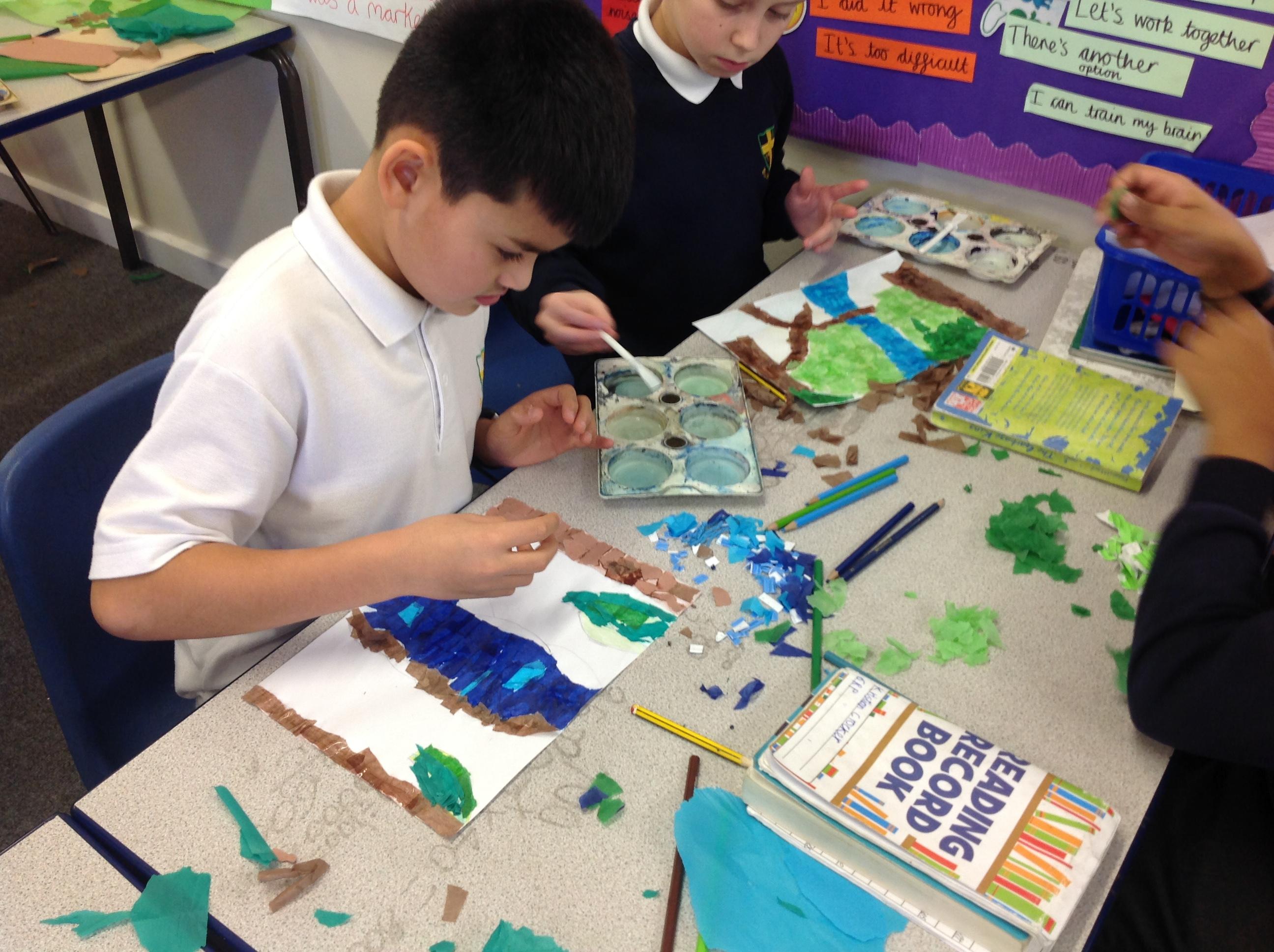 In week 4, we have been practising our collage skills in art. Firstly we practised blending the tissue paper to create different shades and colours and then we used some materials from nature like leaves, sticks and grass to add to the different textures that we created. Our Prove it was to create a forest scene.