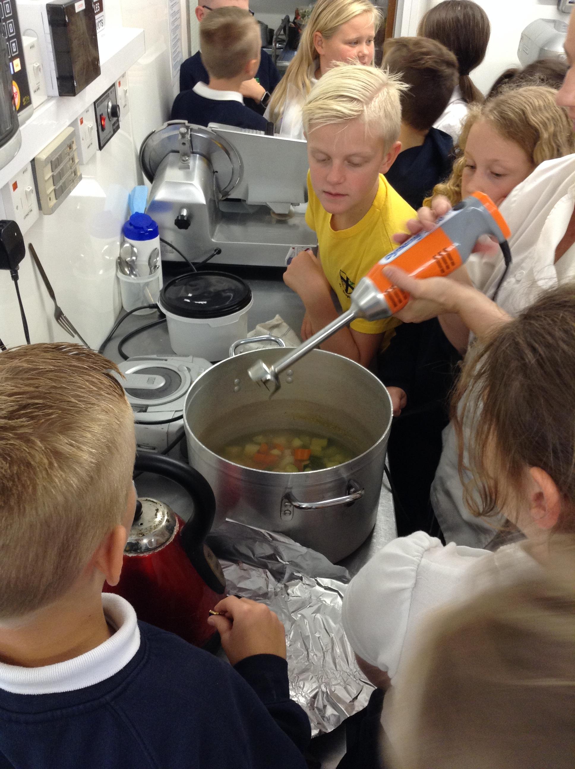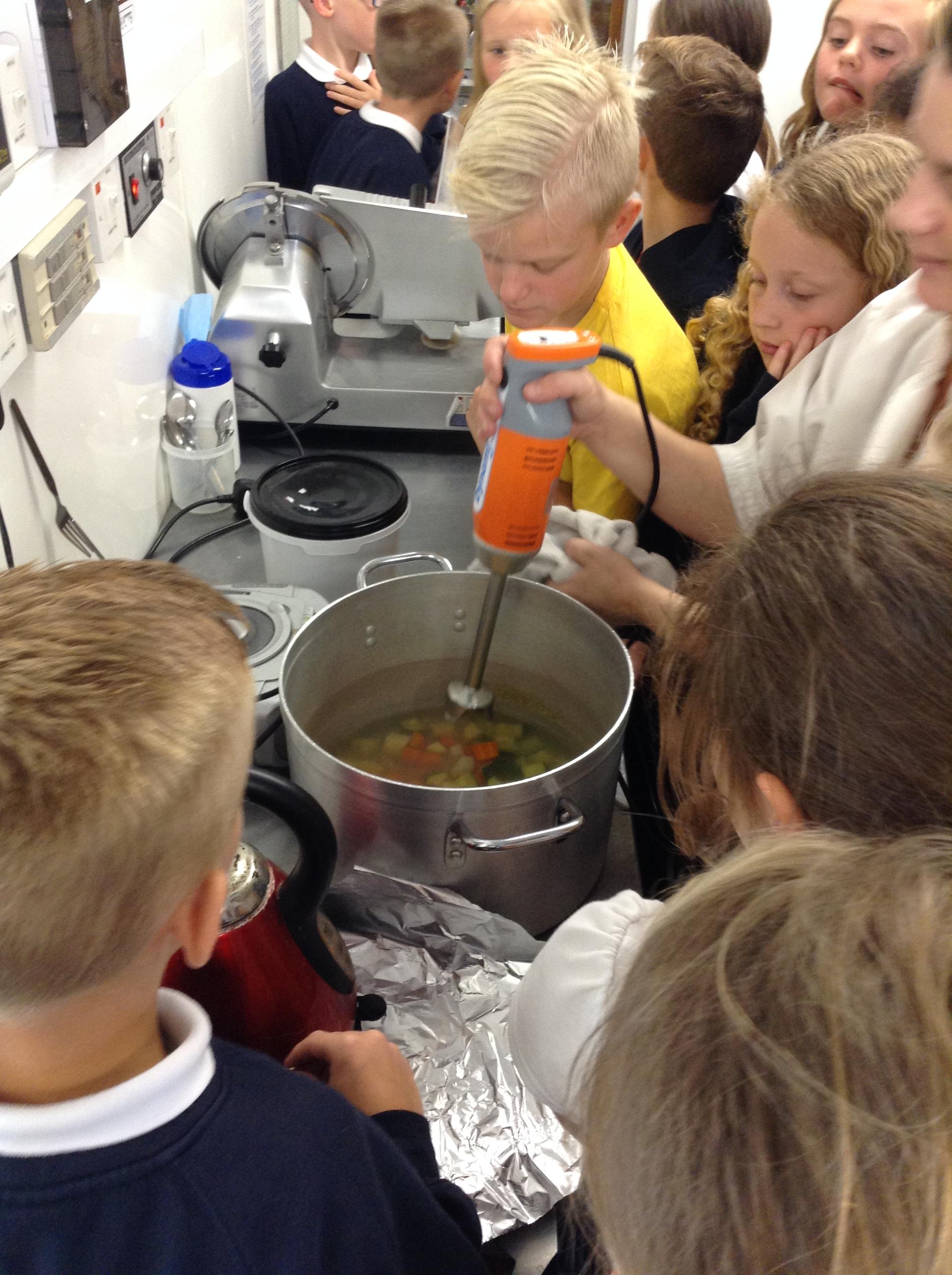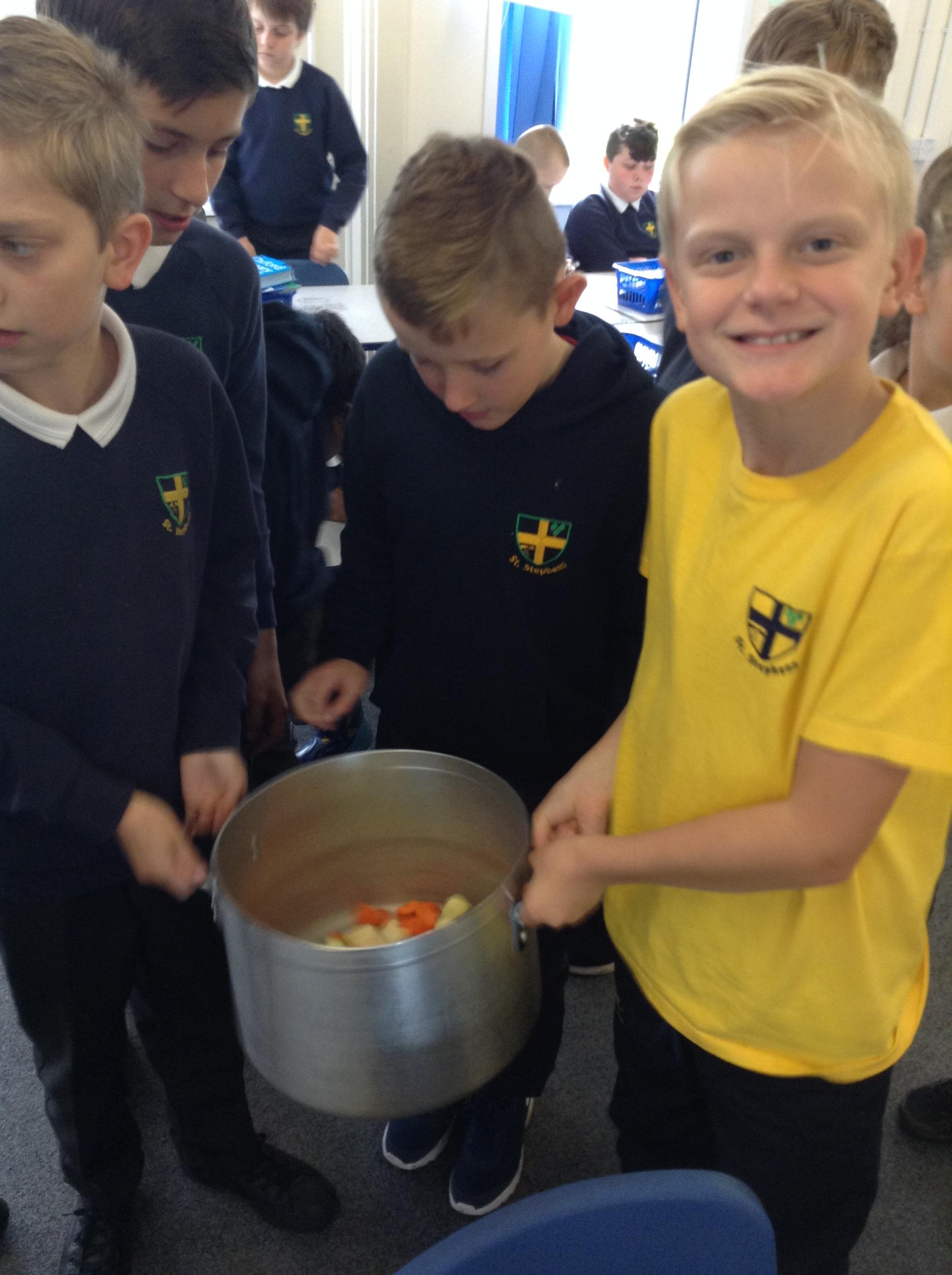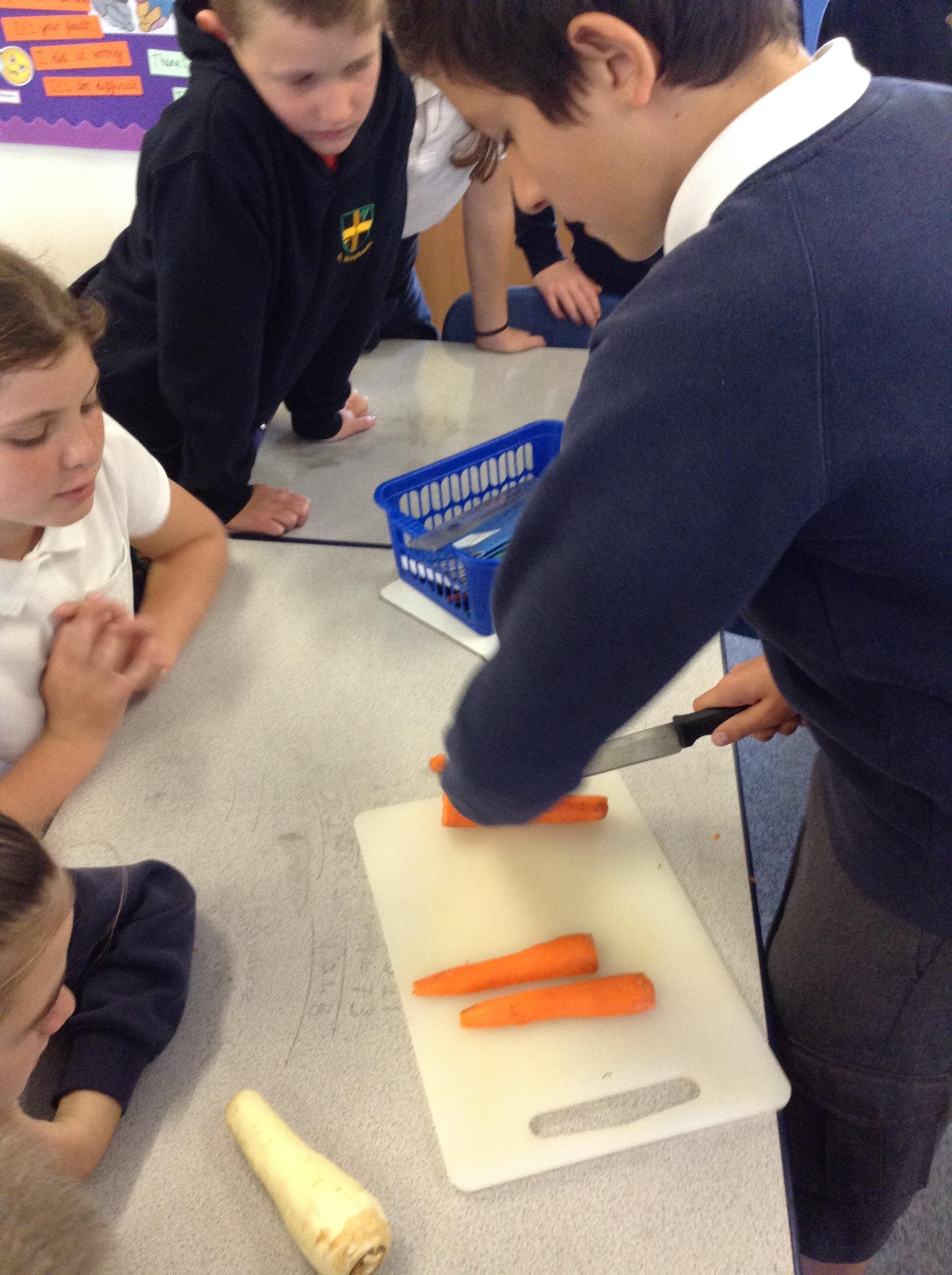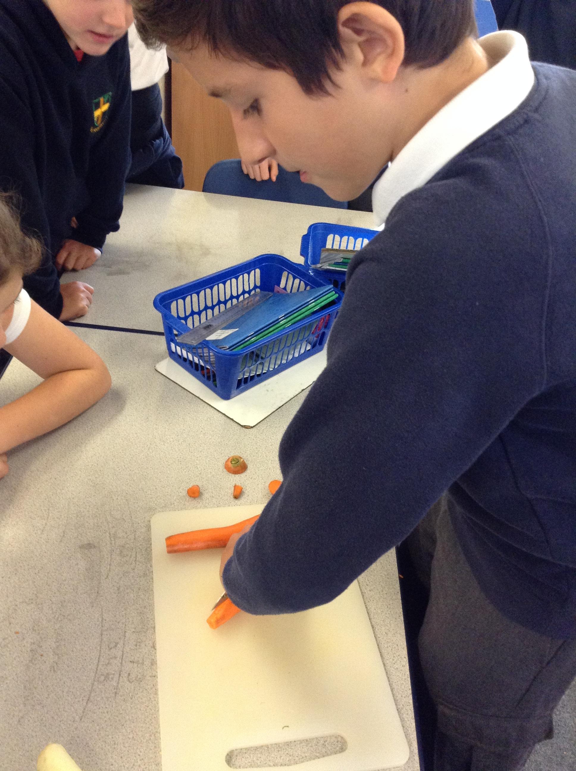 This week, we were presented with a variety of foods that were rationed (we only had small amounts) to create recipes from. It was challenging because we were missing some vital ingredients like salt and pepper! We decided that a vegetable soup would be the best way to use up most of the rations so we helped to peel, cut, boil and blend the vegetables to create a delicious soup that we enjoyed tasting!