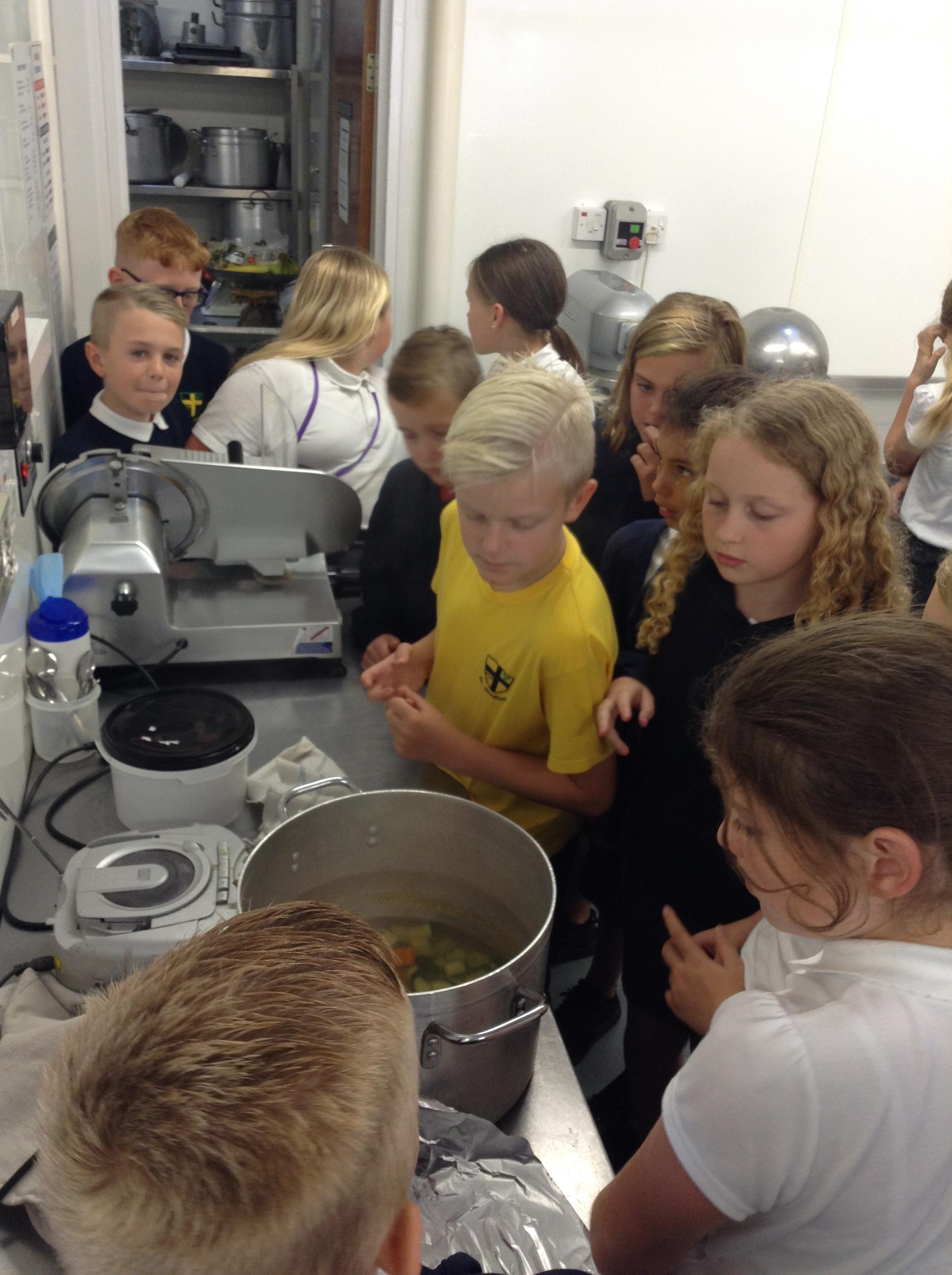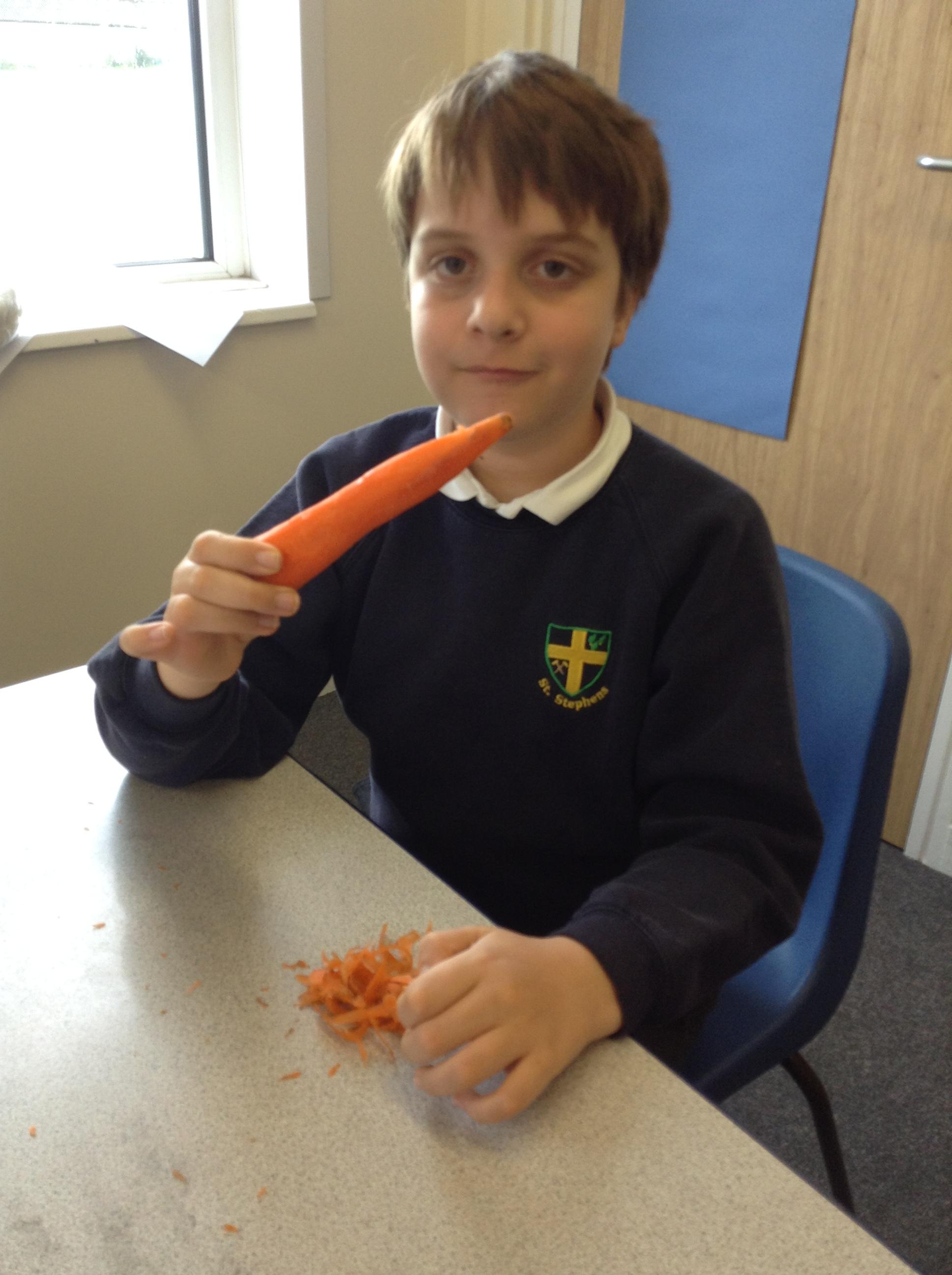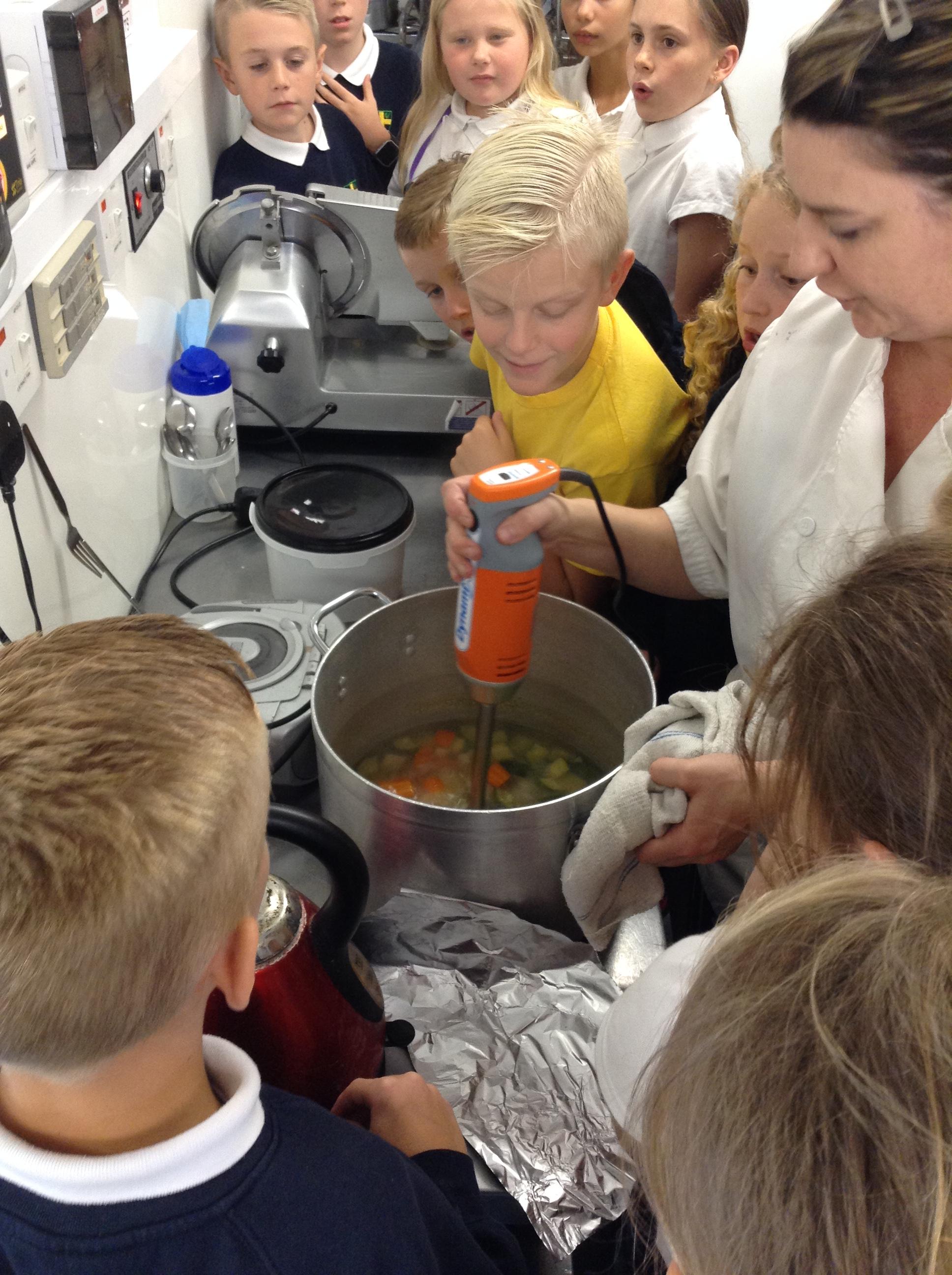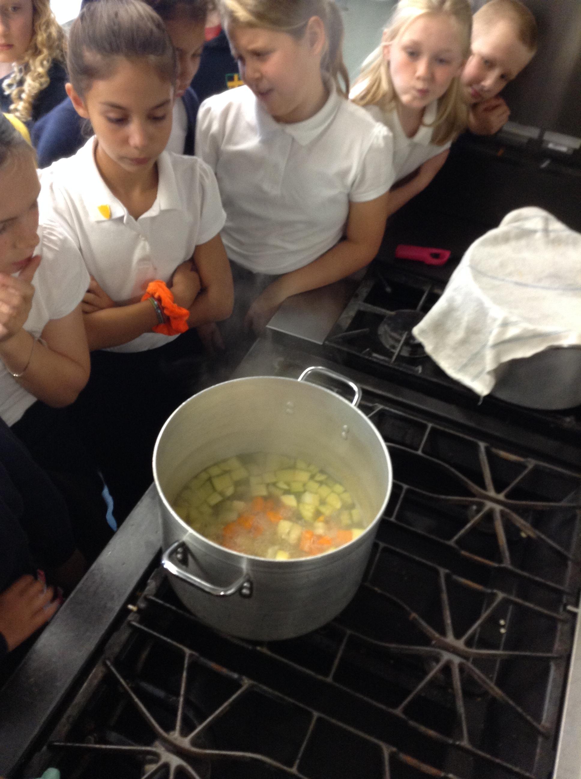 This week, we were presented with a variety of foods that were rationed (we only had small amounts) to create recipes from. It was challenging because we were missing some vital ingredients like salt and pepper! We decided that a vegetable soup would be the best way to use up most of the rations so we helped to peel, cut, boil and blend the vegetables to create a delicious soup that we enjoyed tasting!