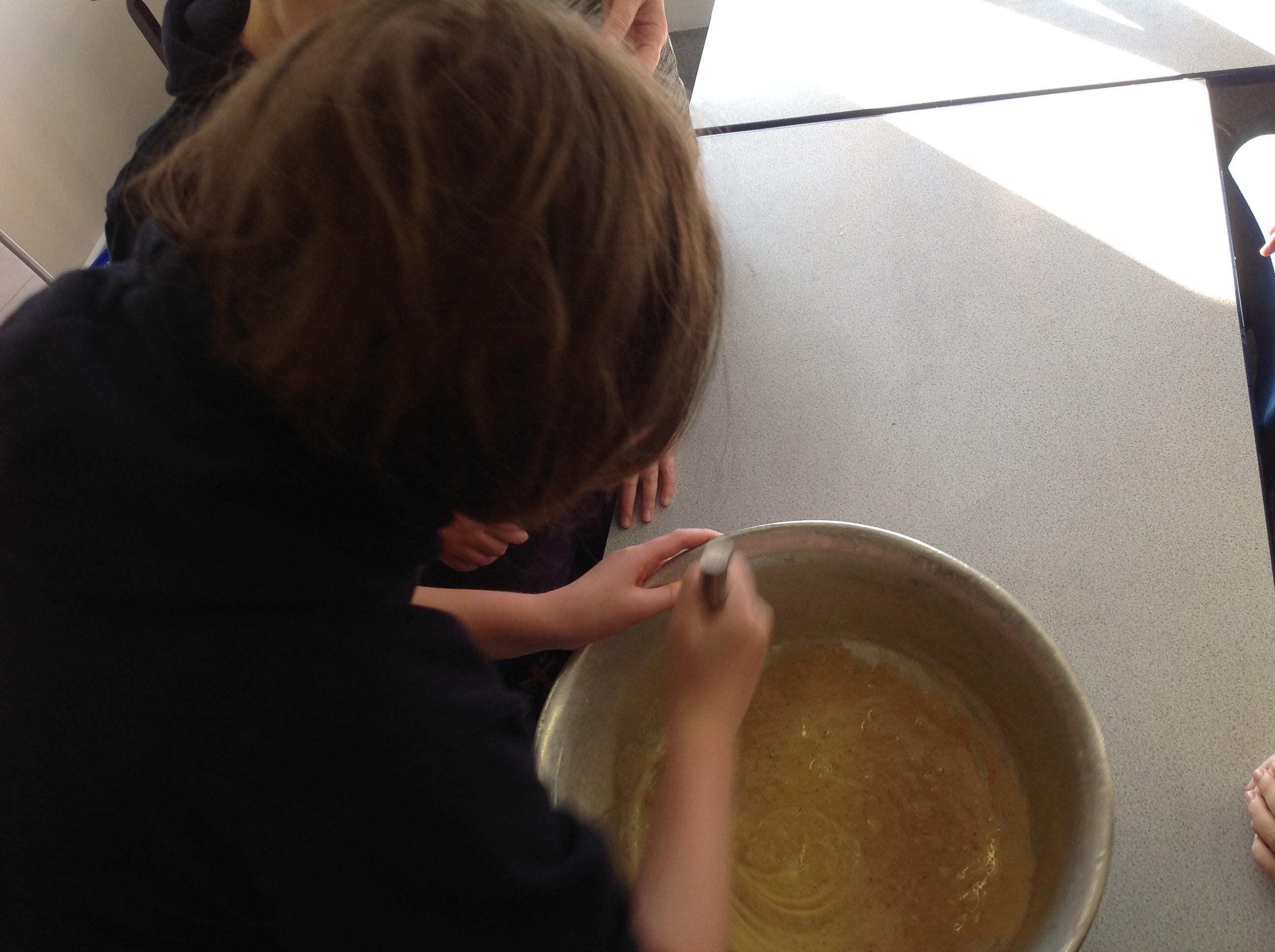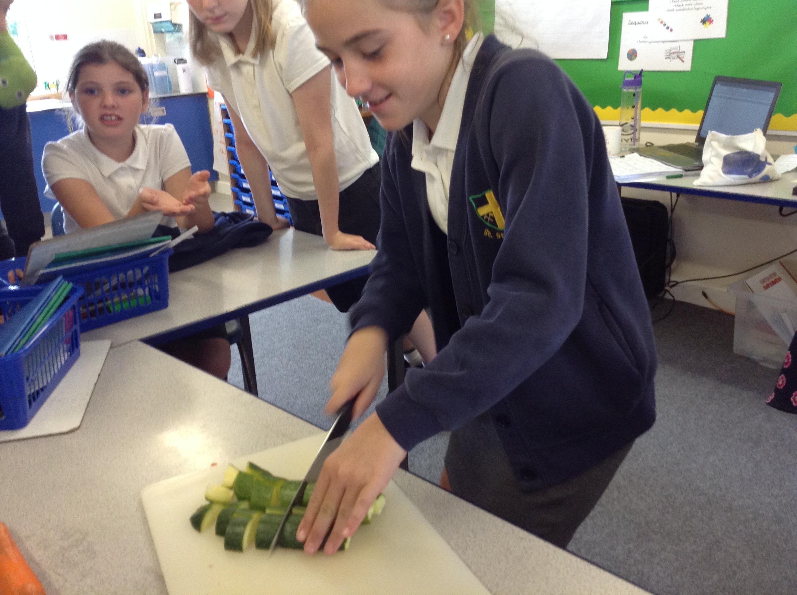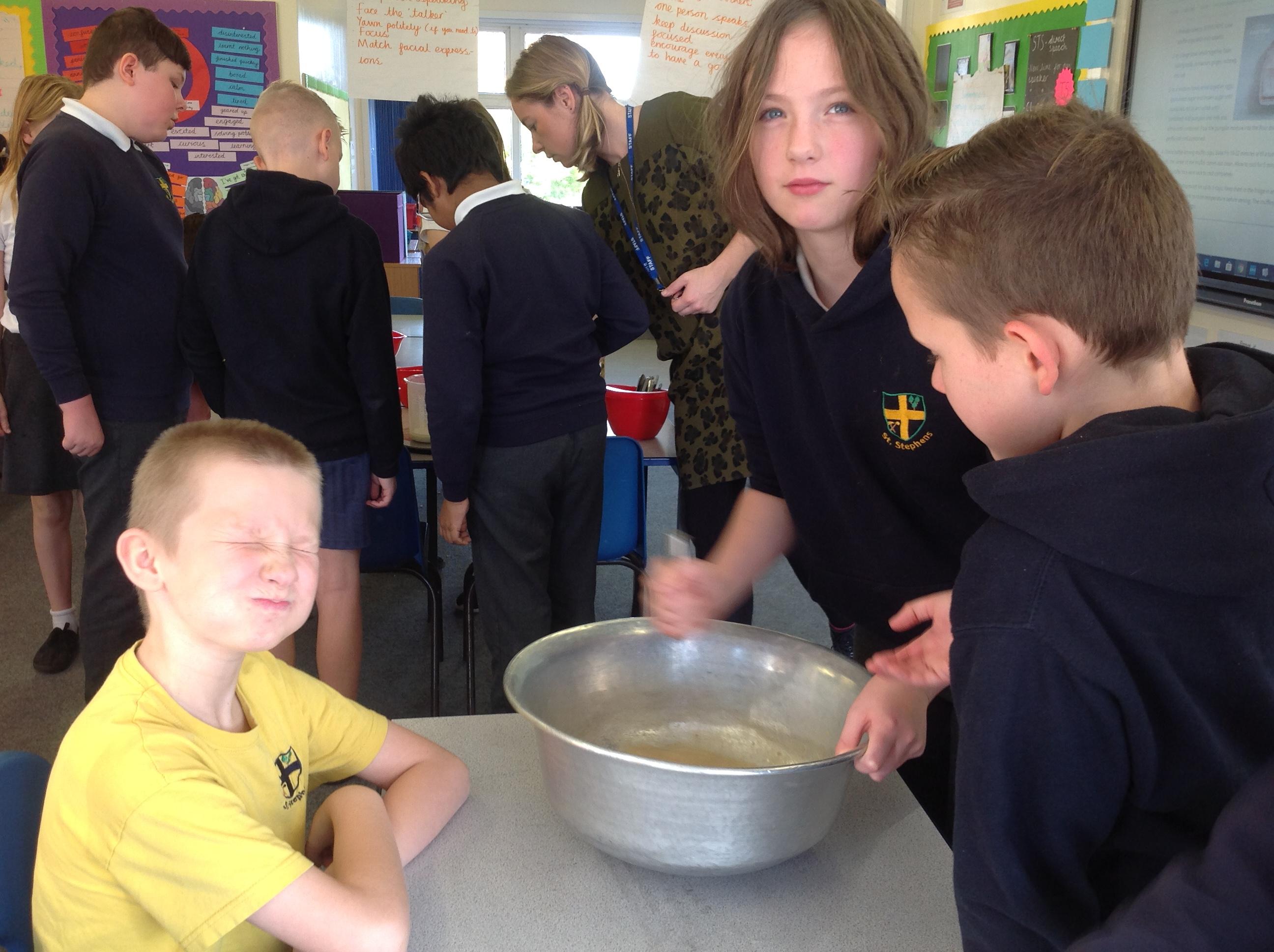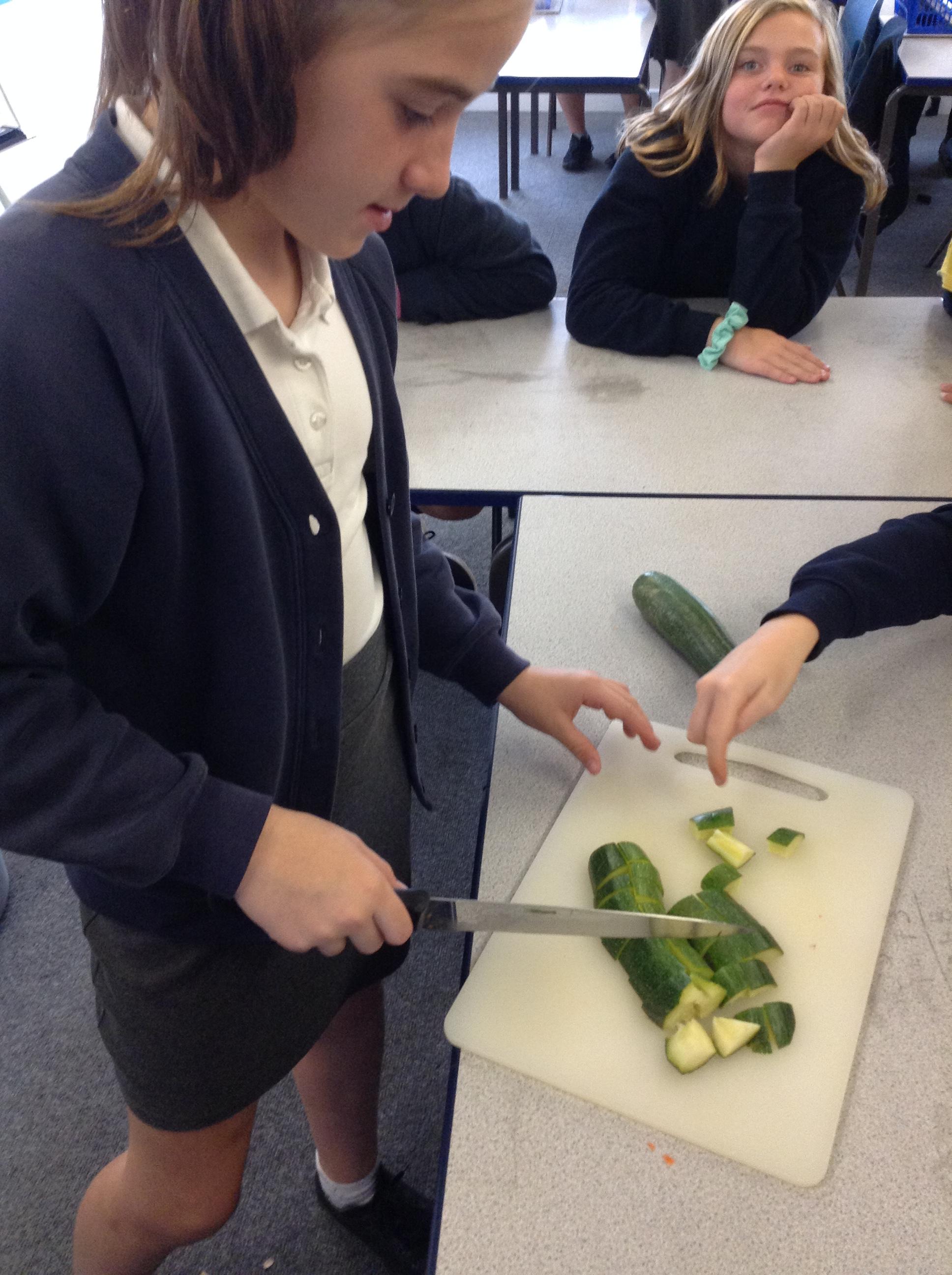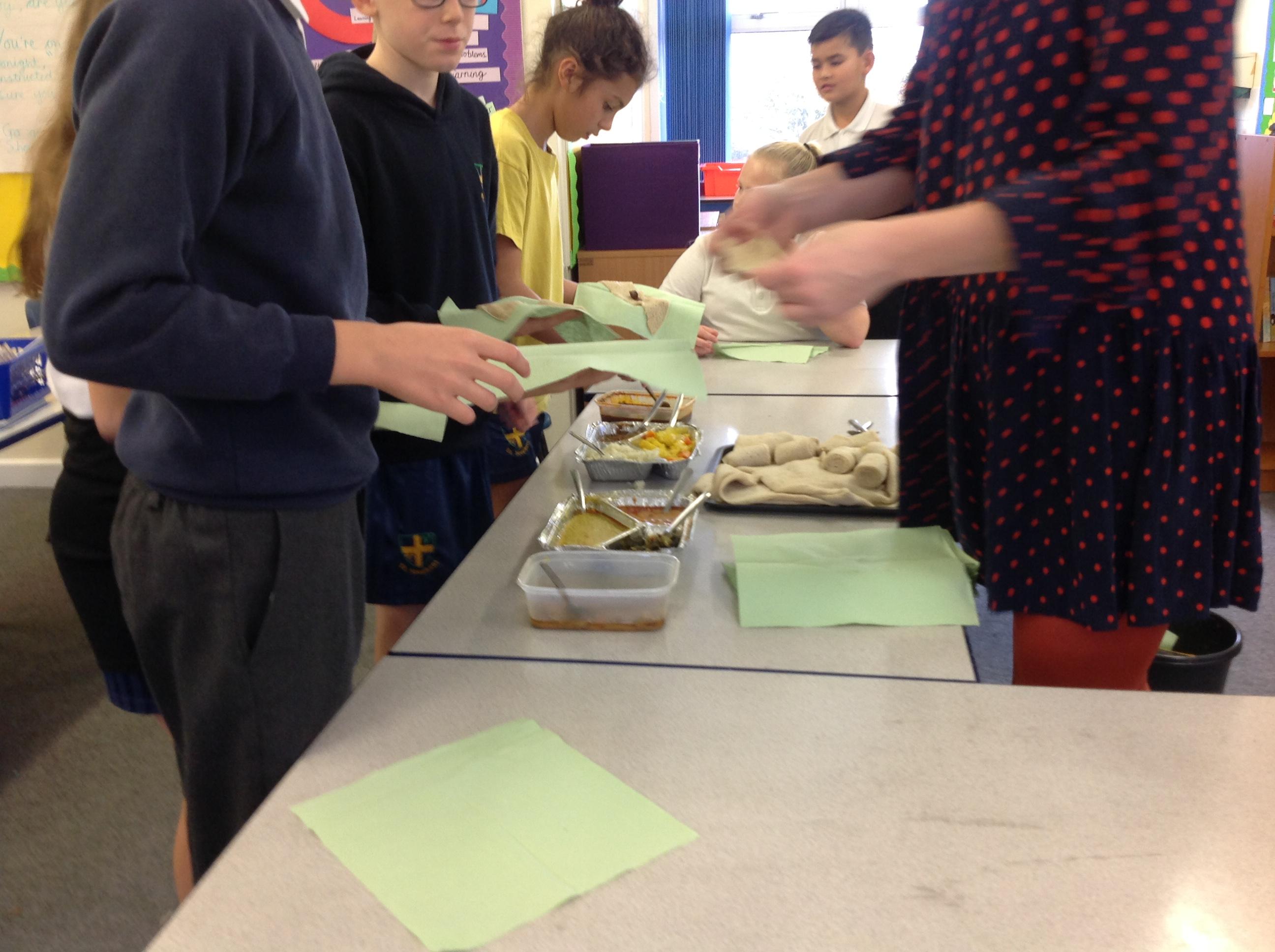 This week, we were presented with a variety of foods that were rationed (we only had small amounts) to create recipes from. It was challenging because we were missing some vital ingredients like salt and pepper! We decided that a vegetable soup would be the best way to use up most of the rations so we helped to peel, cut, boil and blend the vegetables to create a delicious soup that we enjoyed tasting!
