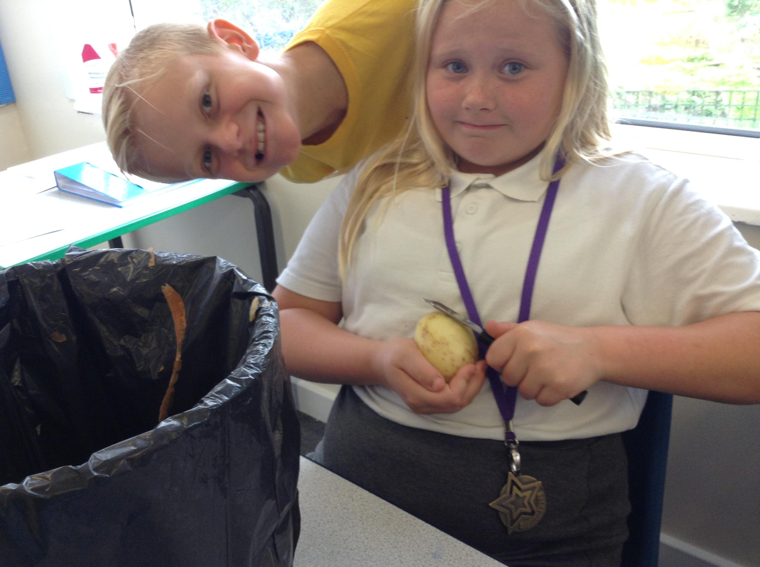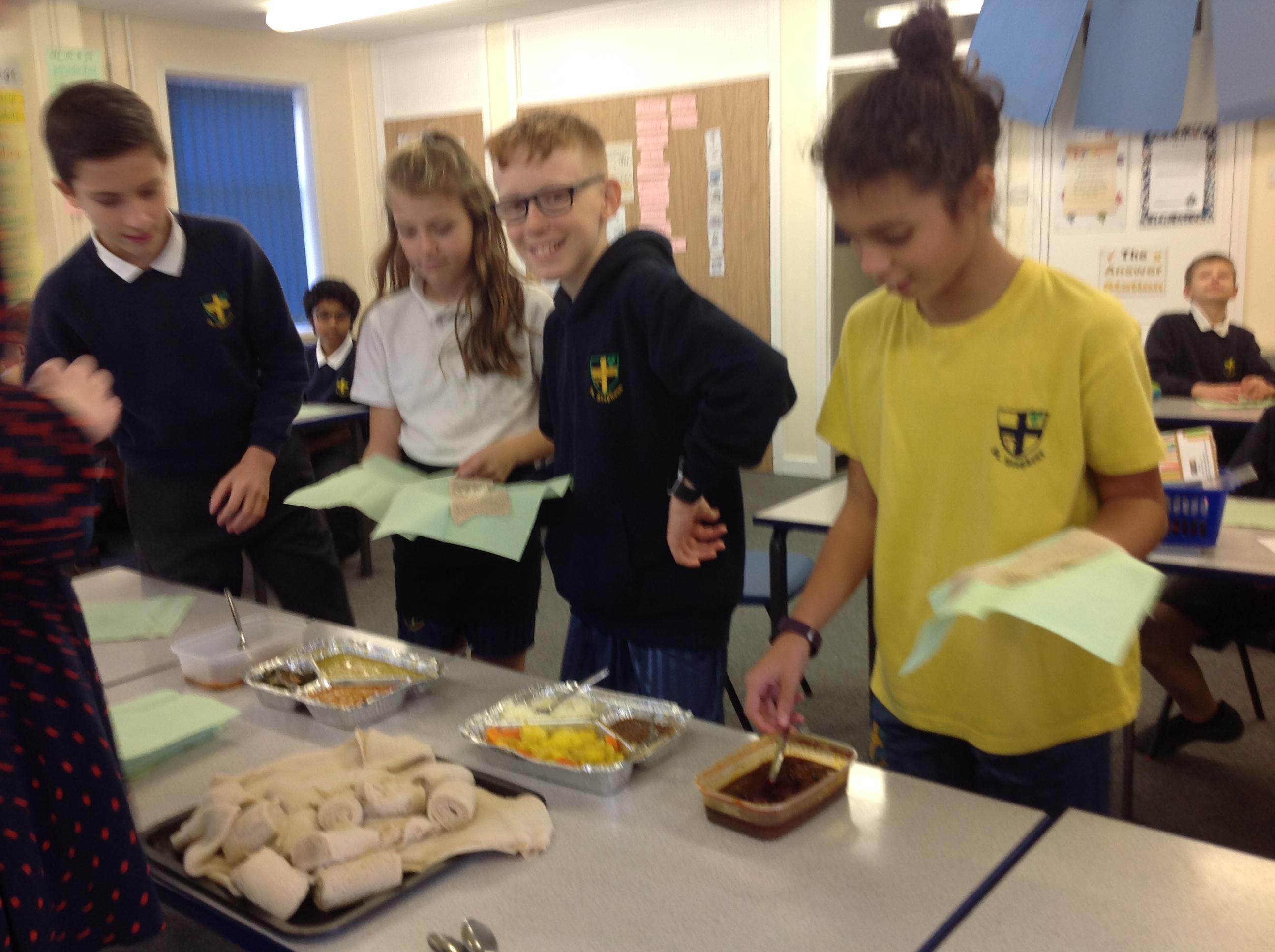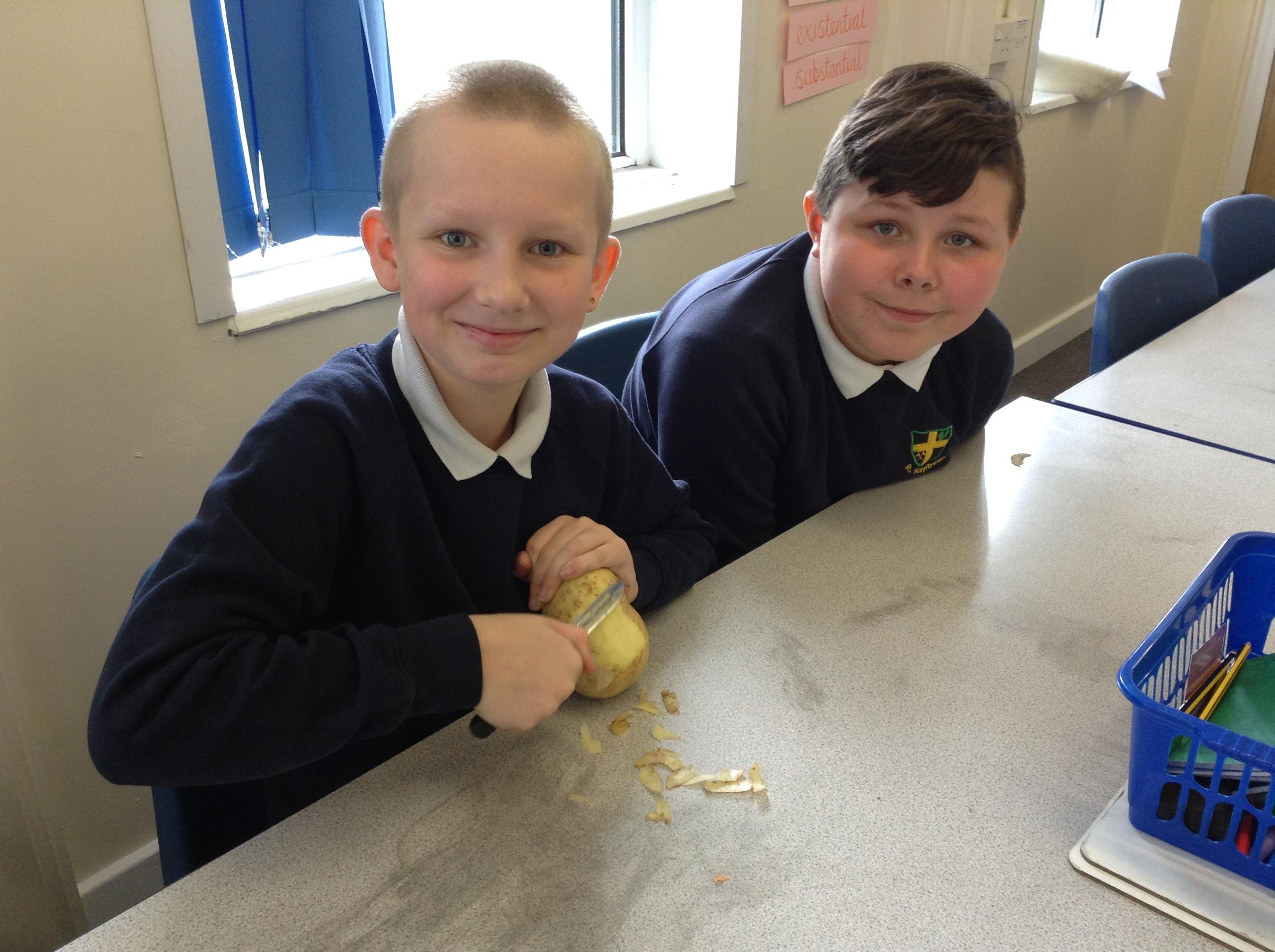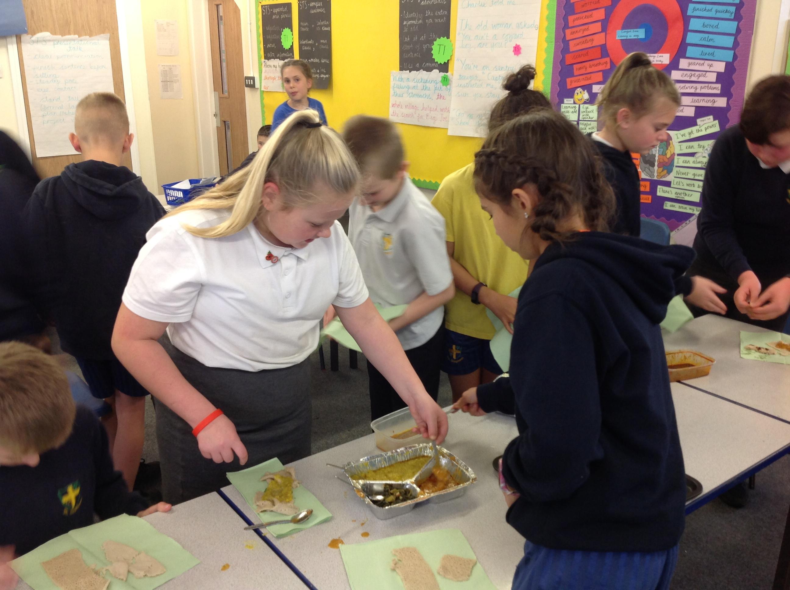 This week, we were presented with a variety of foods that were rationed (we only had small amounts) to create recipes from. It was challenging because we were missing some vital ingredients like salt and pepper! We decided that a vegetable soup would be the best way to use up most of the rations so we helped to peel, cut, boil and blend the vegetables to create a delicious soup that we enjoyed tasting!