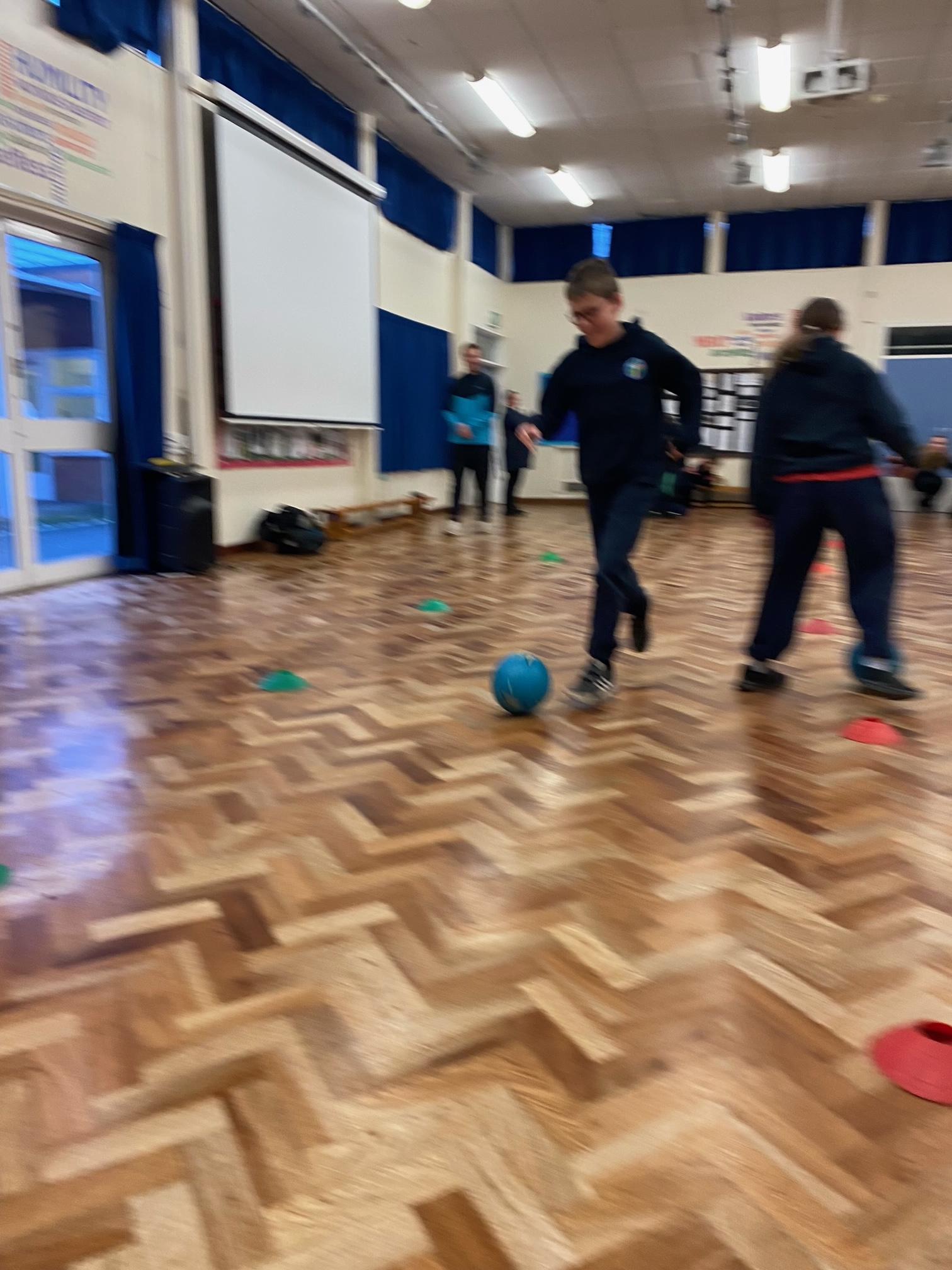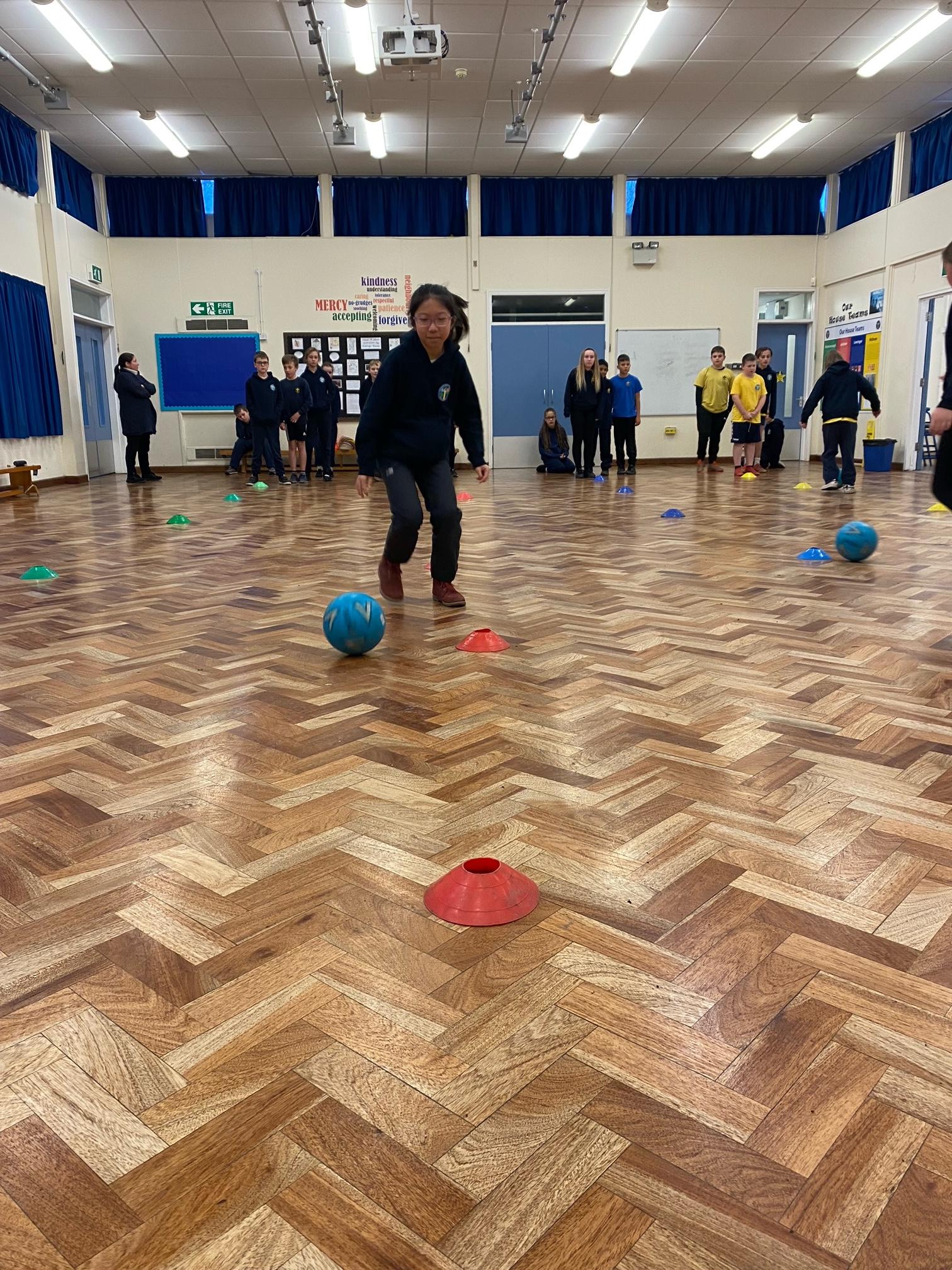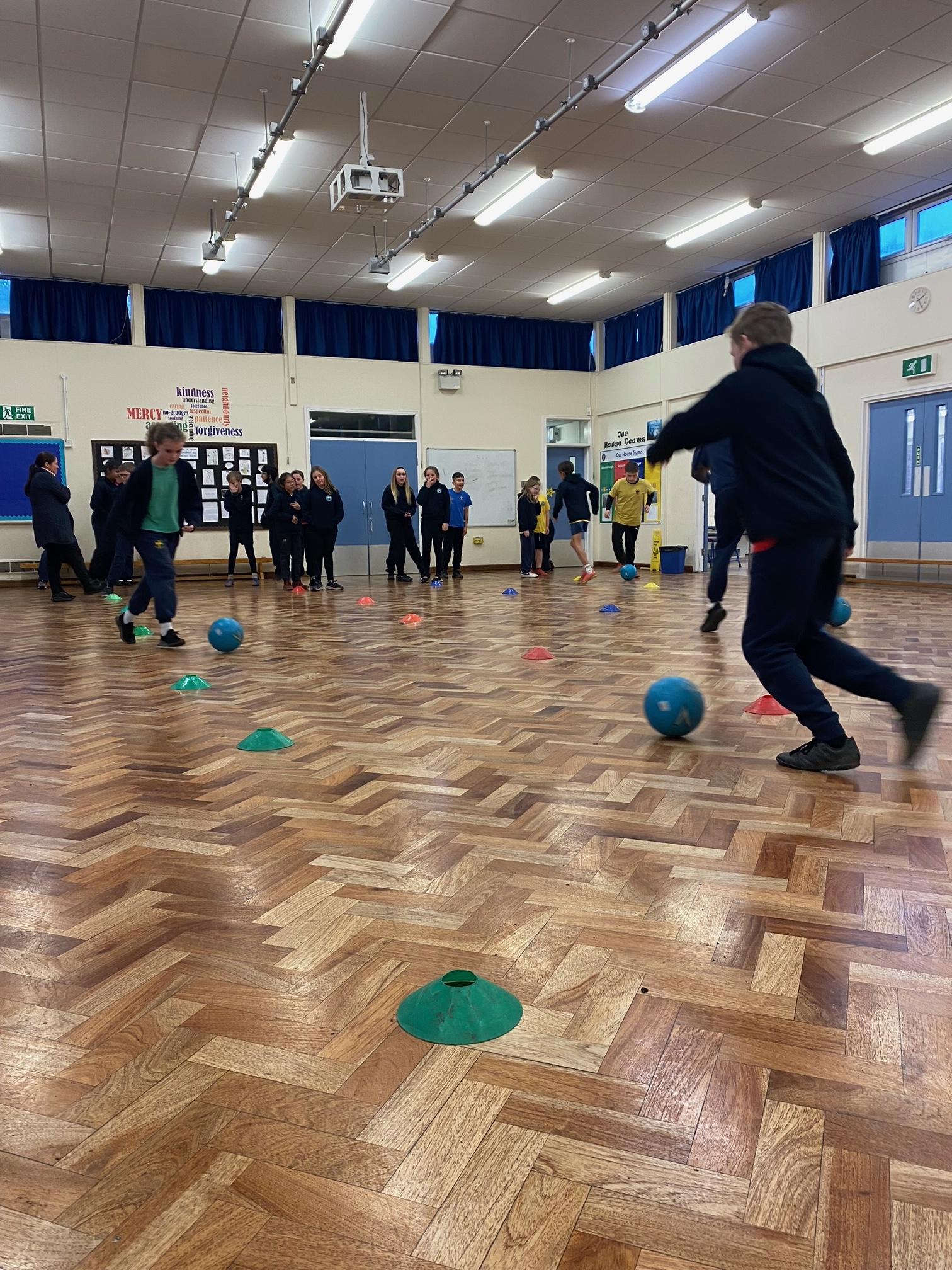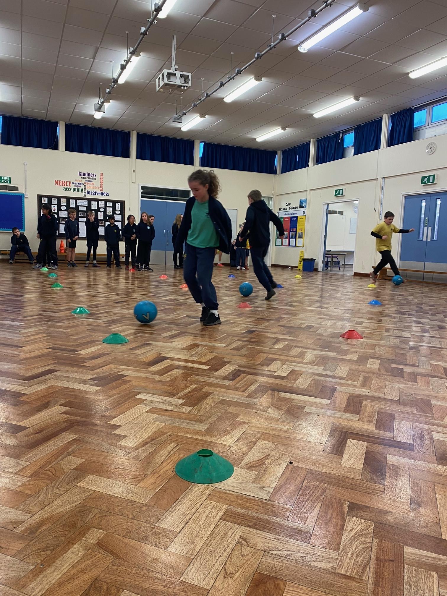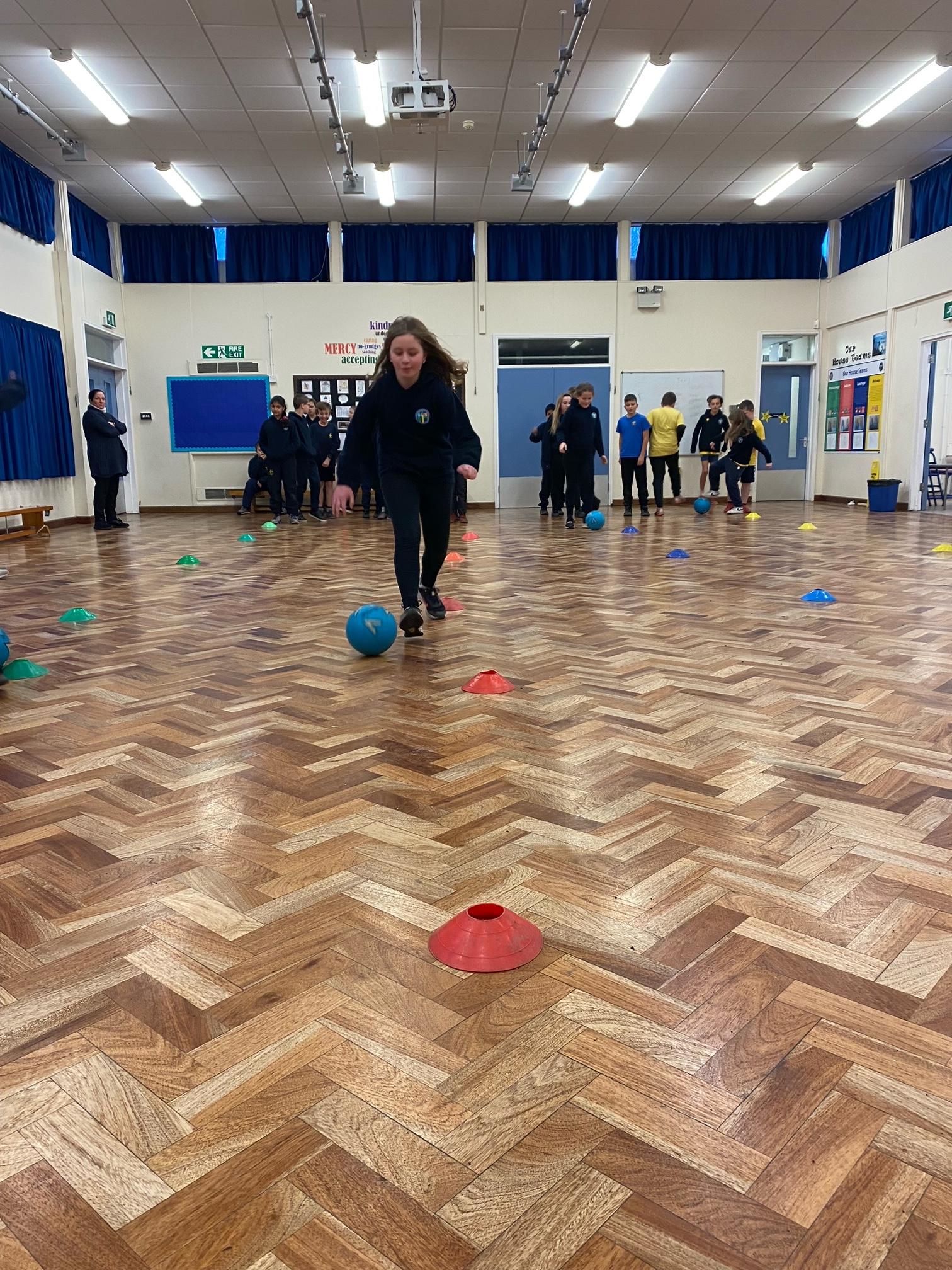 This term we've been honing our football skills on the outdoor pitch. However in the final week, teachers from Mangotsfield secondary came in to challenge us to beat each other in a House Dribbling Relay Race!