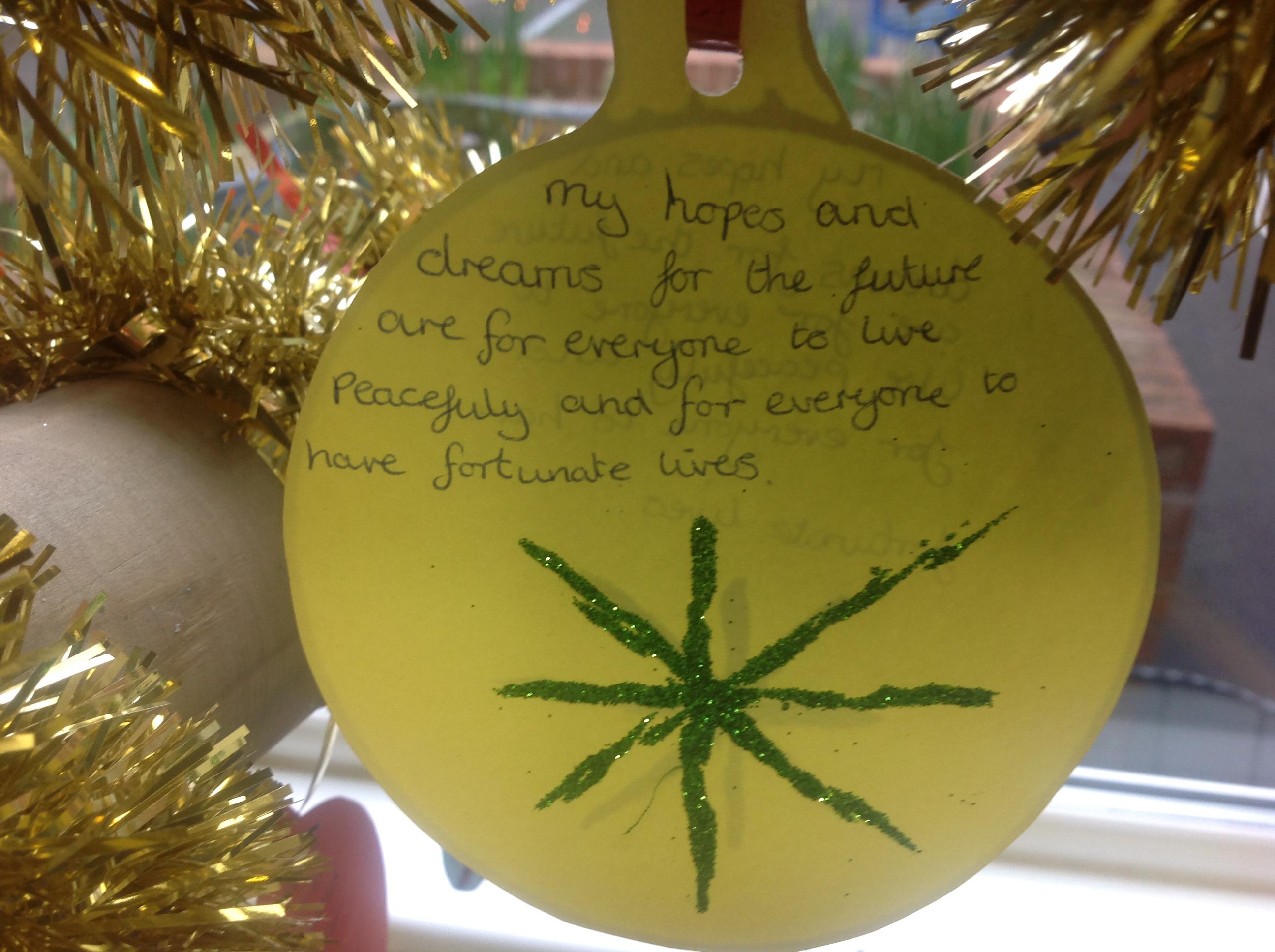 Following on from thinking about the 'essence' of Christmas, each class thought about their hopes and wishes for Christmas and beyond and made baubles for our Values 'Christmas' Tree.