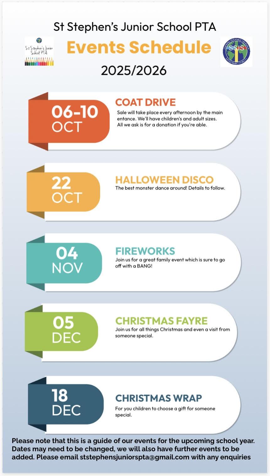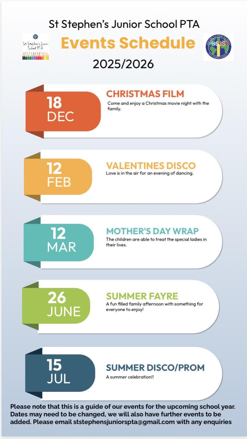 We cannot run our popular fayres and other events without assistance from our parent community. PTA Officers are always interested to hear your thoughts and accept any offers of help. You can catch us in the playground or drop us a message at our Facebook page ‘St Stephens Junior School PTA’. You can also email us at ststephensjuniorspta@gmail.com